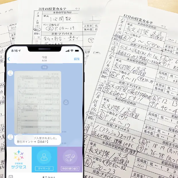 毎回の授業内容を記録した「授業カルテ」が保護者のLINEに終了後、送信されます。遅刻がなかったか、集中度や宿題のでき具合など含め、授業を担当した講師の手書きの記録が届きますので、安心です。電子化され、授業後すぐに送信されますので、お子様が“保護者に見せない”などのストレスがありません。