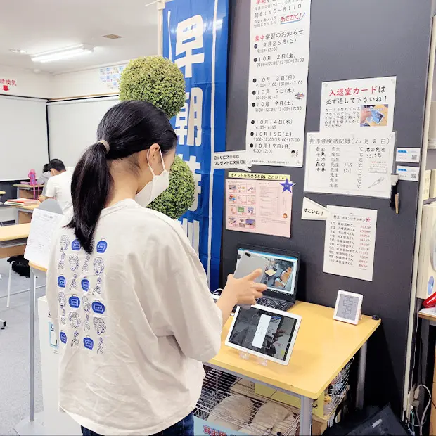塾生カードを全員に発行。塾に来た際にタブレットに読み込ませると、保護者(生徒も)のLINEに「○○さんが入室しました」というメッセージがリアルタイムで送信されます。