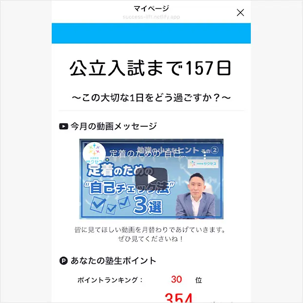 全員(保護者・生徒)にLINE内で塾オリジナルの「マイページ」を発行しています。生徒ごとにテストまでのカウントダウン表示もあります。また塾からの動画配信やお知らせなどがわかりやすくまとめられています。「振り返り機能」でその日の学習内容を記録したり、LINE内で塾にコンタクトをとることも手軽にできます。