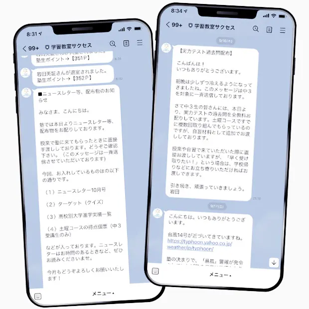 配布物のお知らせ、各種申込の期限のお知らせ、模試の案内、教室の様子などなど・・・ 塾の情報を随時お知らせしています。(月に5~6通程度送信するかと思います)「生徒に配布物を渡したが、保護者の方は知らなかった」というのを防ぎます。またそれに対して質問があれば、LINE内で質問もしてもらえます。
