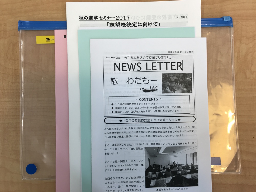 さて、塾では昨日より10月のニュースレター等、お配りしています。