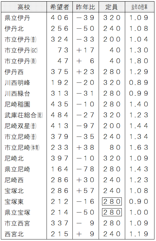 県立伊丹・伊丹北・市立伊丹はここだけを見ると希望者は昨年より減っているのですが、尼崎稲園が「435」と高いということからすると、そこから志望校を落としてきた子らが県立伊丹・伊丹北・(市立伊丹)に回ってくる数が一定見込まれますし、予断は許されない状況です。