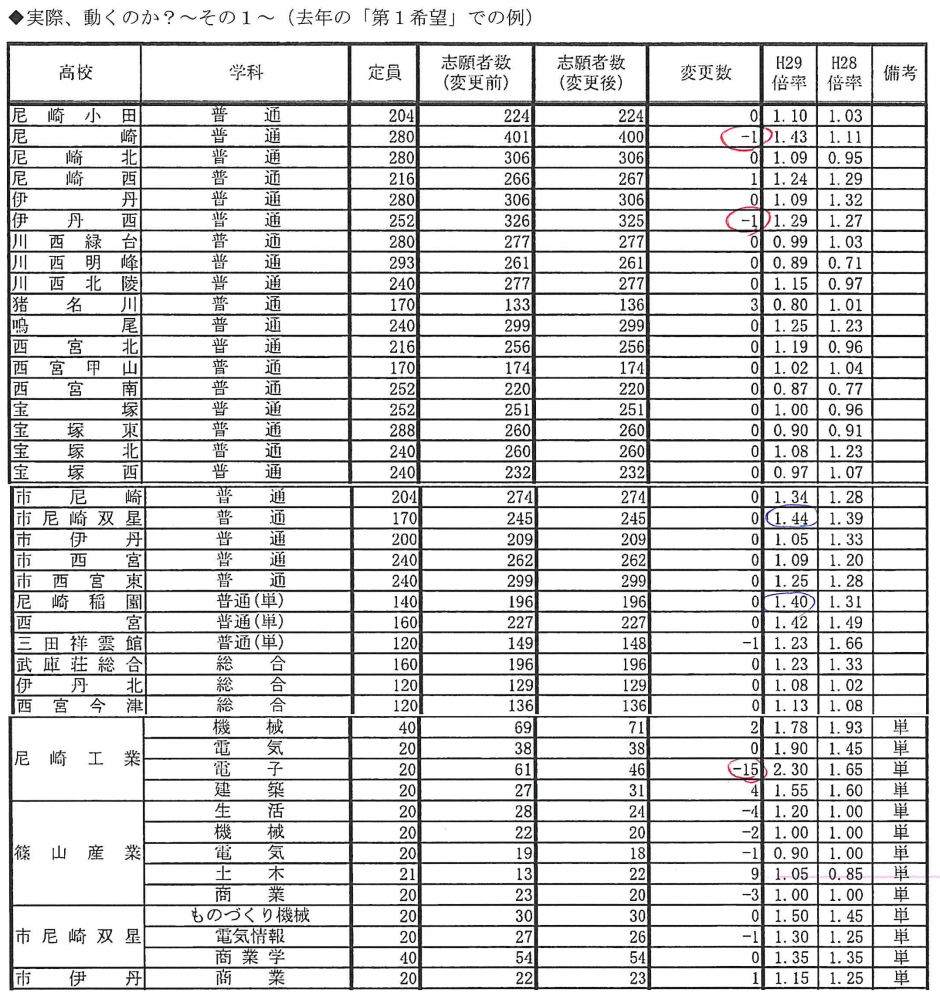 ・尼崎西では第1希望での倍率が1.29となり「-13」に繋がった。西宮南(去年は+10)でもそうだが、第1希望での倍率を見て、第2を替えてくる層が一定数いる。