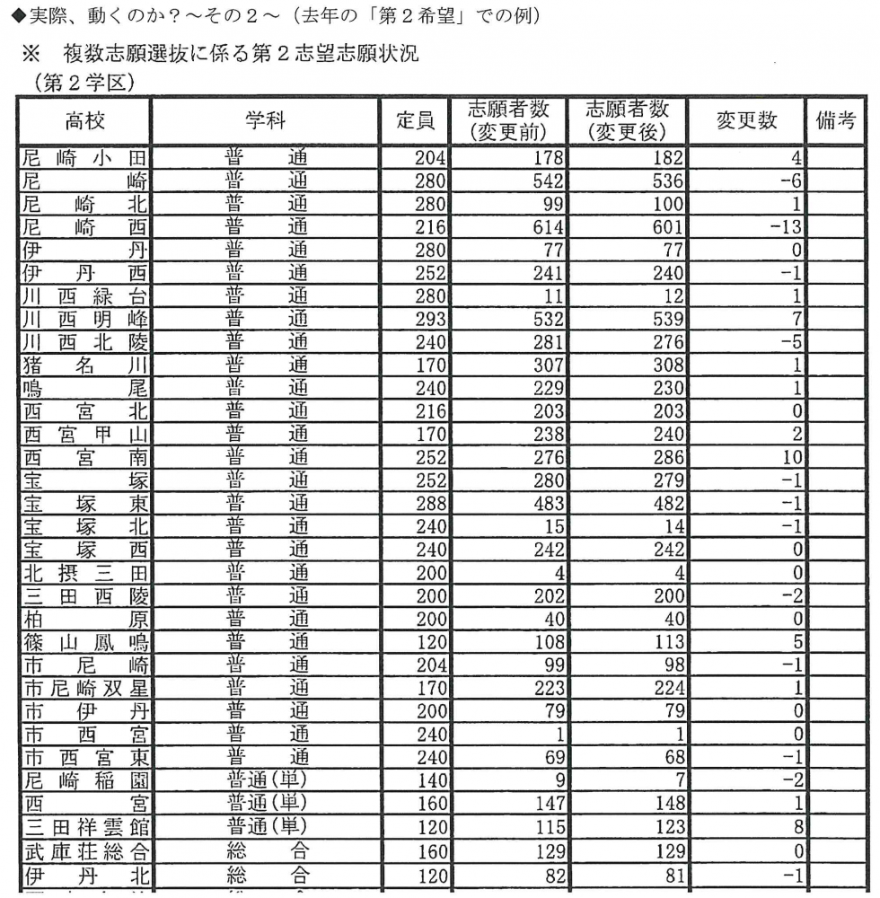 ・第2志望の志願変更者は、例えば尼崎西では「-13」、川西明峰では「+7」などそれなりに動きは認められる。