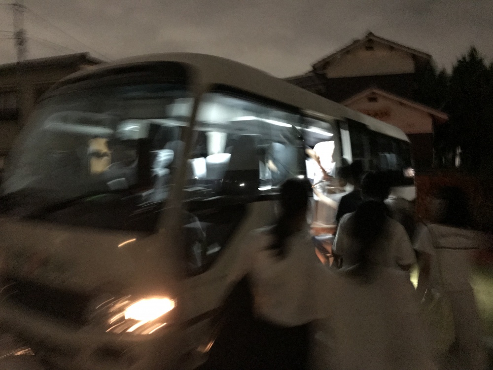 午後8時ぐらいから境内地で花火をして、そして何と先頭に行くためだけの貸し切りバスに乗り、先頭へ。