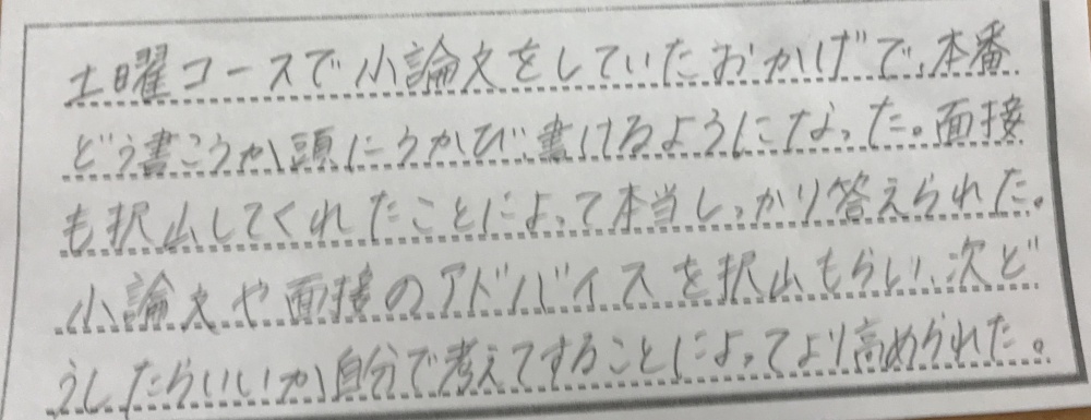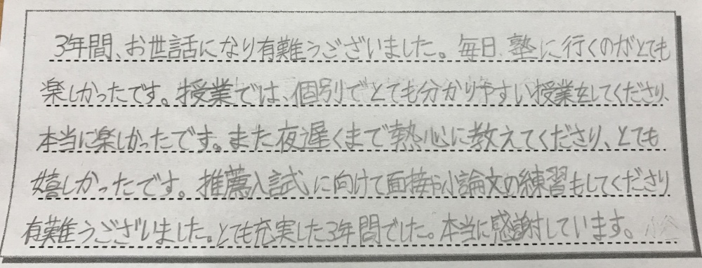 最後に、今回合格後に塾に来てくれた際に、無事合格した子たちが書いた「喜びの声」を少し紹介させて下さい。