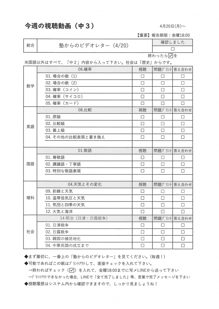 しばらくは、塾長が毎週動画を届けます!(編集は小6の娘が担当)。