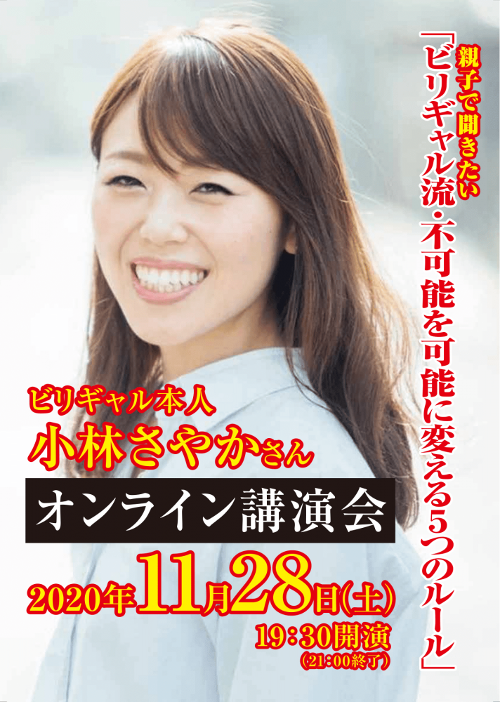先日11月28日(土)の夜、予定していたオンライン講演会を行いました。今回、映画化もされた「ビリギャル本人」小林さやかさんのお話でした。