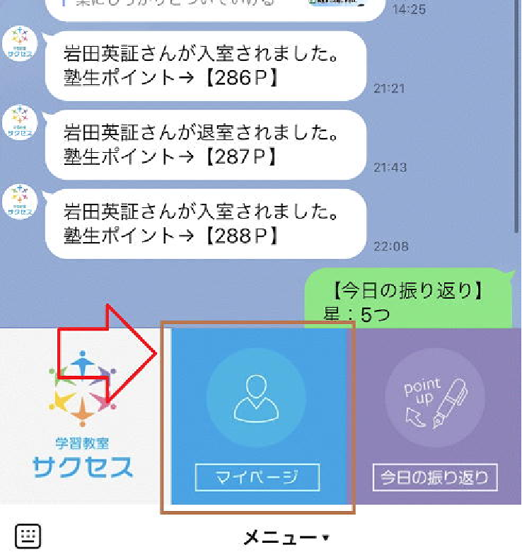 カルテや入退室の情報を受信するLINEの画面に「マイページ」があります。