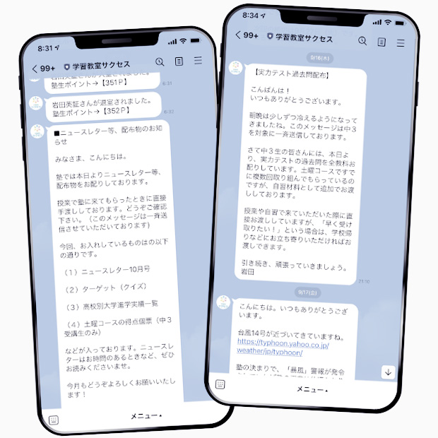 Family System ご家庭と塾をつなぐシステム 通信物/懇談会/授業記録など 各ご家庭と連携しながら生徒を育てます 手書きの授業記録がLINEに届くので安心! 毎回の授業内...