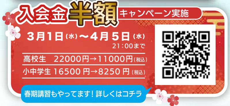 の期間で入会手続きをいただいた場合、入会金を半額にさせていただいております。