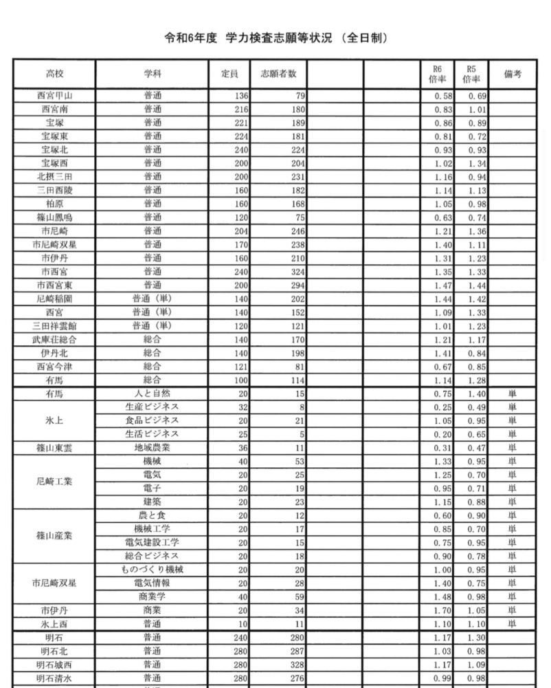 元々多めには出ていましたが、そのまま保ちましたね。市立伊丹も去年の倍率を超え(今1.31倍です)、伊丹西もそれに並んでいます。(1.31倍)