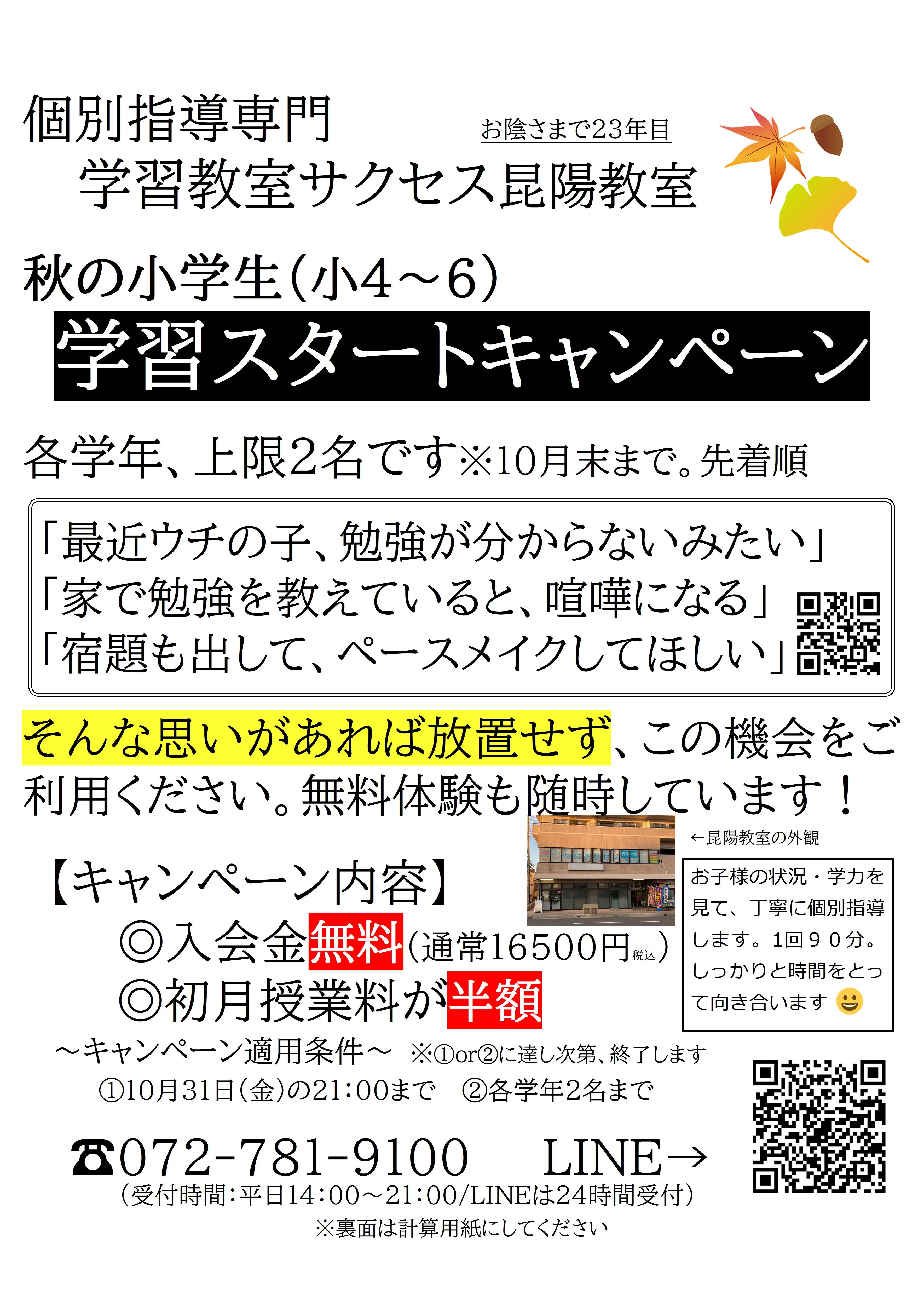 この冬のキャンペーンは、通常料金よりもお得に塾に入会できる絶好のチャンスです。期間限定のため、早めのご相談をおすすめいたします。お子様の学習環境を整えるための第一歩を、ぜひこの機会にご検討ください。詳しい内容やご不明な点については、お気軽にお問い合わせください。