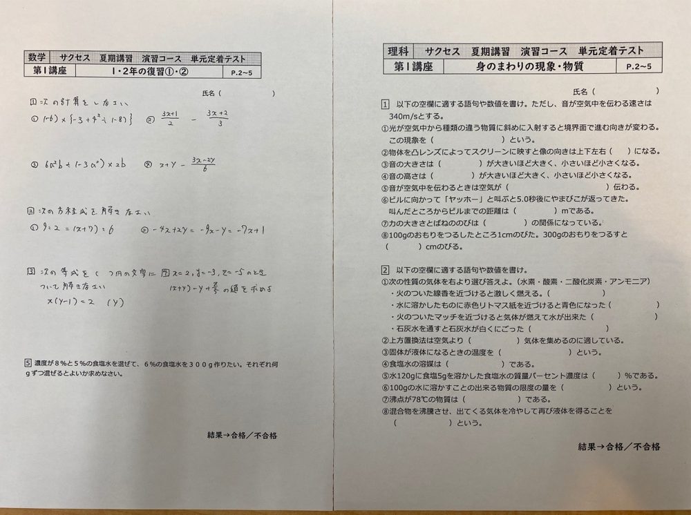 中3生には毎年演習コースというものを実施しており、夏期講習で勉強した内容など中1・2年の復習を主に行うコースとなっております。夏期講習で使用した教材を演習コース用ノートに再度解き直して以下の写真のような確認テストを受け、記憶への定着を行っています。