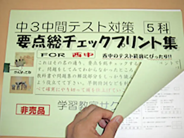 完全オリジナルで各学校の範囲に合わせ、作成。各科目(5教科)、その範囲でポイントとなる例題や基礎用語を60程度に絞り込んで、心をこめて配布します。