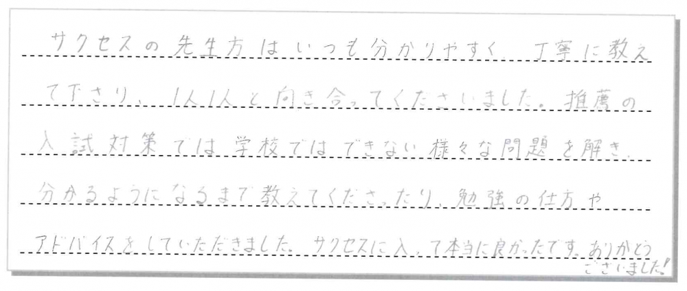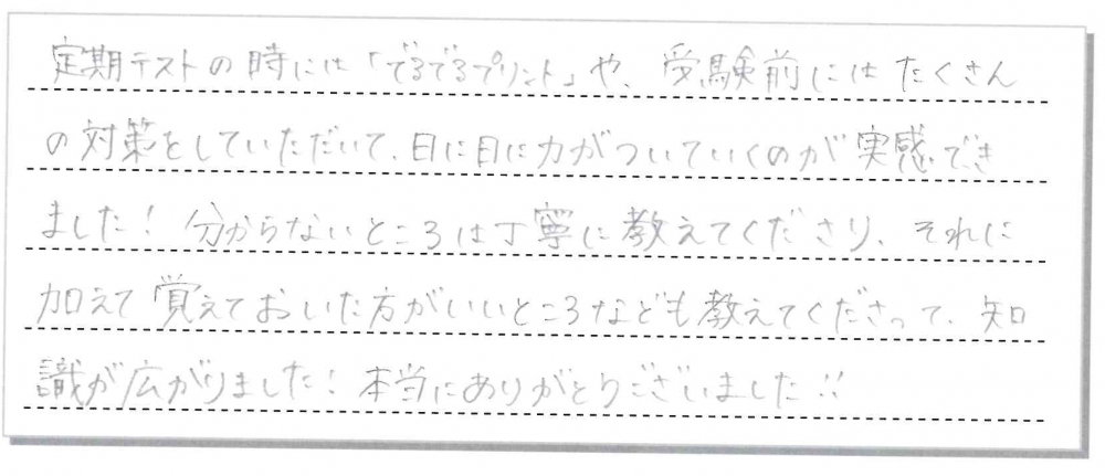合格発表の日に直接報告に来てくれた生徒さんには、塾へのメッセージを書いてもらい、嬉しい言葉をたくさんいただきました。