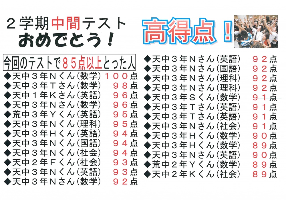 市内統一の実力テストでも数学で100点が2名いましたので、嬉しい限りです(^^)