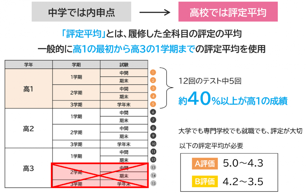 高校になると評定平均と言われ、これは高1~高3の1学期までの値です。