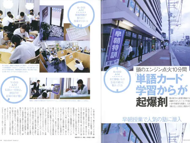 開塾以来16年以上続く早朝学習。昆陽教室ではテスト前1週間は朝6時40分から8時10分までで行います。中野教室でもテスト当日に行っています!これに毎日参加し、爆発的に成績を向上させた子は数限りなくいます。(もはや把握できないぐらい多いです)ここから得られる成果は大きく、諸機関からの取材や見学も多いです。右の紙面は『プレジデントFamily』に特集された紙面です。