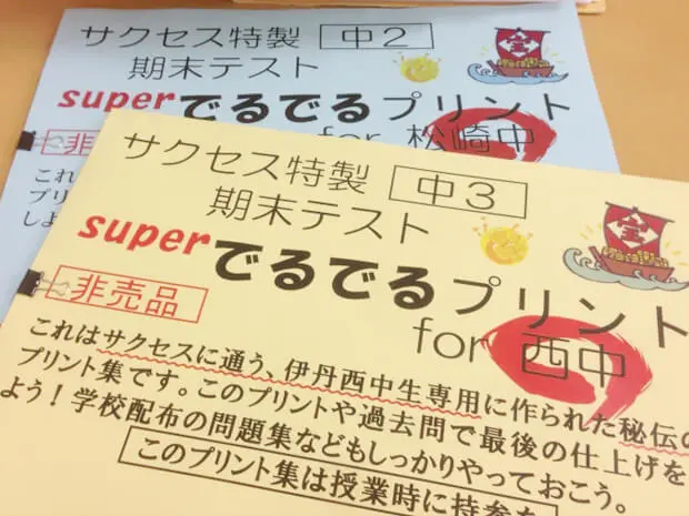 もちろん中学校別にテスト範囲が異なります。それに合わせた対策プリントを毎回手間暇かけて作成。表紙をつけ、心を込めてお一人お一人に渡しています。いわば“虎の巻”。基本の仕上げをした上で、このプリント集で最終の仕上げをすることにより得点力は格段に上がります。